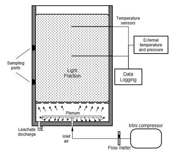 The airflow rates were controlled even if, as observed by Velis et al. [13], the oxygen stoichiometric demand for aerobic decomposition is satisfied by oxygen provided by the high aeration necessary for effective drying. The composition of the gas in the reactors (concentrations of methane, carbon dioxide and oxygen) was periodically measured using a portable infrared gas analyzer (Ecoprobe 5, RS Dynamics, Praha, Czech Republic) integrated with an oxygen analyzer. During the trials, the measured oxygen concentrations were always above 10% (data not shown).