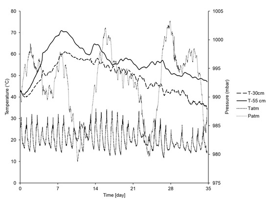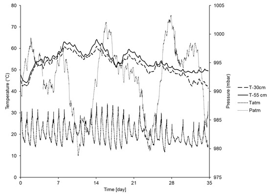 The temperature in the LF mass was monitored using two K-type thermocouples at 30 cm and 55 cm of depth. As the reactors were outside, the external temperature and atmospheric pressure were also measured (barometric pressure transducer, Delta Ohm-HD 9908 BARO, Padova, Italy). Data were logged every 5 min using a programmable automation controller (Compact Field Point, National Instrument Inc., Austin, TX, USA).