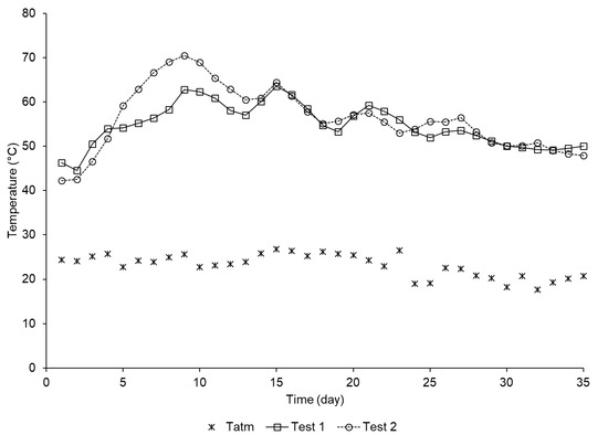 In Test 1 (Figure 3) the internal temperature reached three peaks of 63 °C, 64 °C and 59 °C after 8, 14 and 20 days, respectively. After 20 days the temperatures gradually decreased, probably together with the microbial activity. The temperatures recorded by the upper probe (30 cm of depth) were lower than those recorded at the bottom (55 cm of depth) but showed a similar trend. A maximum difference of 8 °C was measured, lower than in other studies in which higher temperature gradients were found (about 30 °C) during the initial high-microbial activity phase [14,15]. Therefore, in the case of this study, it is supposed that the gradient of temperature was due to the external conditions on the upper temperature sensor rather than to the heterogeneity of the simulated biodrying processes. The temperatures measured in the reactor were affected by the day–night cycle of external temperature that caused tiny variation of the internal conditions.