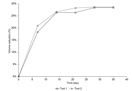 The most significant volume reduction (Figure 6), detected during the first 14 days in both the tests, was probably due to a natural auto-compaction effect. At the end of the trials, the volume of biomass was reduced by 28% in Test 1 and 29% in Test 2. In addition, a significant reduction in the sample weight, measured as the difference between the initial and final weight, occurred. A weight loss of 48%, probably due to moisture reduction, was estimated in Test 1. Despite the higher water content reduction achieved in Test 1, a similar weight loss was found in Test 2 (47%). These values were lower than the final weight loss reported by Colomer-Mendoza et al. [12] in trials with and without a bulking agent.