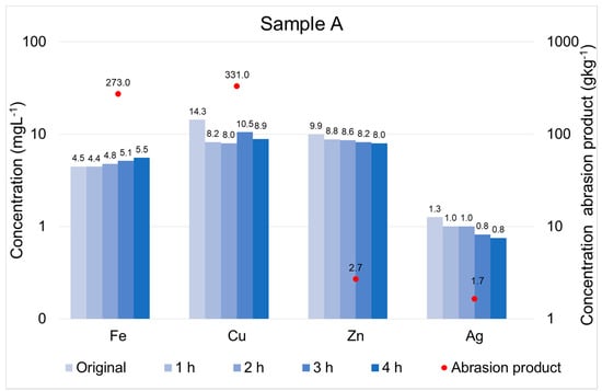 Evolution of the dissolved concentrations (blue bars) and concentrations in the resulting abrasion product (red dots) of Fe, Cu, Zn, and Ag during the Ferrodecont treatment of sample A.