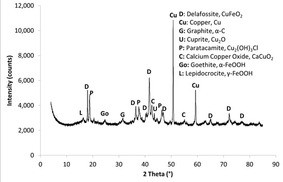 XRD analyses (Figure 3) reveal that Cu is present as metallic Cu, delafossite (CuFeO2), cuprite (Cu2O), paratacamite (Cu2(OH)3Cl) and calcium copper oxide (CaCuO2), whereas Fe is bound to goethite (α-FeOOH), lepidocrocite (γ-FeOOH) and also delafossite. With respect to recycling, the presence of metallic Cu is positive, whereas the presence of Cu compounds indicates further requirement for beneficiation. Regarding the iron phases, it can be concluded that complete oxidation to Fe(III) might have been supported by air injection, as in our previous study [] also Fe(II)-containing magnetite (Fe3O4) was formed. Considering the mass balance, it is suggested that most of the Cu phases were already present as suspended particulate matter in the initial waste water. However, the drop in dissolved Cu concentration and the intense interaction between Cu species and ZVI suggests that a part of the delafossite might have formed during the Ferrodecont process.