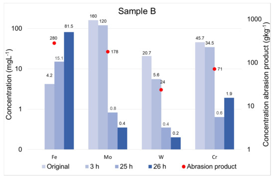 For sample B, during the experimental duration (26 h), the dissolved Mo concentration decreased from 160 mgL−1 to 0.35 mgL−1, that of Cr from 45.7 mgL−1 to 1.91 mgL−1 and that of W from 20.7 to 0.20 mgL−1 (Figure 3). This suggests removal of these elements from the solution due to interaction with ZVI and its corrosion products. In contrast, dissolved Mn concentrations increased from <0.02 mgL−1 to 4.4 mgL−1 and that of Fe even from <0.1 mgL−1 to 130 mgL−1. This is related to the dissolution of ZVI granules which have incorporated some Mn as alloying element.