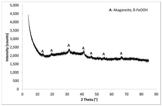 XRD analyses (Figure 5) of the abrasion product derived from sample B demonstrate that in contrast to the abrasion product obtained from sample A the removed metals do not form distinct crystalline phases. Instead, the XRD pattern shows a very high background, especially in the range between 20 and 45 °2θ which is assigned to amorphous phases. The only crystalline phase is akageneite (ß-FeOOH), a mineral phase which might be considered as a polymorph of goethite but forms at higher Cl concentrations of the aqueous solution and incorporates Cl in its crystal structure []. It is suggested that the presence of akageneite and amorphous FeOOH in the abrasion product of sample B is due to higher Cl concentrations and lower pH values (4.0 compared to 4.6 after pH adjustment), respectively, which is in agreement with literature data []. Anions were neither determined in the liquid nor in the solid samples, but high alkali metal concentrations in the initial waste water sample B suggest a high salinity. Therefore, it is suggested that akaganeite forms during Ferrodecont treatment of saline waste waters like sample B, whereas goethite and lepidocrocite form during treatment of less saline waste waters. Regarding Mo, Cr and W, two possible mechanisms may occur, the formation of amorphous phases or adsorption onto the surface of akaganeite or amorphous iron phases. As amorphous iron hydroxides are quite abundant whereas amorphous Mo, Cr and W phases are rather exotic, the sorption hypothesis seems more likely and is also supported by a previous study []. Comparing the abrasion products of samples A and B, the most striking difference, i.e., the presence of numerous crystalline phases in case of sample A, might not be due to different interactions of the aqueous solutions with ZVI, but rather due to the presence of suspended particulate matter just in sample A, but not in sample B.
