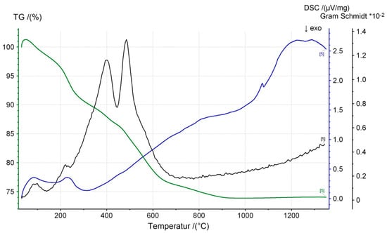 Simultaneous thermal analyses (STA) of the abrasion product of sample A (green line: thermogravimetry (TG), blue line: differential scanning calorimetry (DSC), black line: Gram Schmidt curve).