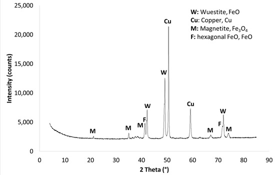 The XRD pattern of the sample that was produced in a vertical furnace at 1300 °C shows an increase in the intensity of the peaks of elemental copper and the neoformation of wuestite (FeO), magnetite (Fe3O4), and a hexagonal FeO polymorph (Figure 7) compared to the untreated abrasion product (Figure 2). All mineral phases which contained Cu in its oxidized state in the untreated abrasion product, i.e., delafossite (CuFeO2), cuprite (Cu2O), paratacamite (Cu2(OH)3Cl) and calcium copper oxide (CaCuO2), are not detectable anymore.