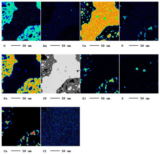 Elemental mappings of the thermally treated abrasion product of sample A support that Cu has been reduced to the elemental state as no oxygen was detected in the Cu-rich area (Figure 9). In summary, these findings demonstrate that in the case of sample A, the residues of the Ferrodecont process can be beneficiated to an easily recyclable Cu concentrate.