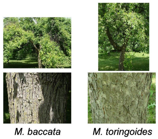 The genus Malus (Rosaceae) consists of 30 species, including the cultivated apple (Malus pumila Mill). Malus baccata and Malus toringoides (Figure 1) are wild taxa that are considered as sources of variation for apple breeding [36]. M. baccata is used as rootstock for commercial apple cultivars and is distributed in Northern America and Eurasia [37]. Few reports have described the chemical composition and biological activities of the fruits [38,39]. Furthermore, no reports have investigated the biological activities of bark extracts. M. toringoides is a drought-resistant wild species [40], and no previous investigations have been performed on the chemical composition of the bark.