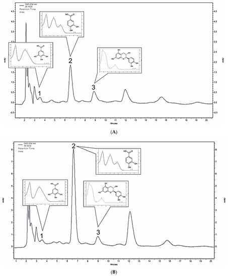 The chromatographic separation of methanolic bark extracts of Malus baccata (A) and Malus toringoides (B) by the high-performance liquid chromatography with a diode-array detector (HPLC-DAD) method; 1—gallic acid, 2—protocatechuic acid, 3—catechin.