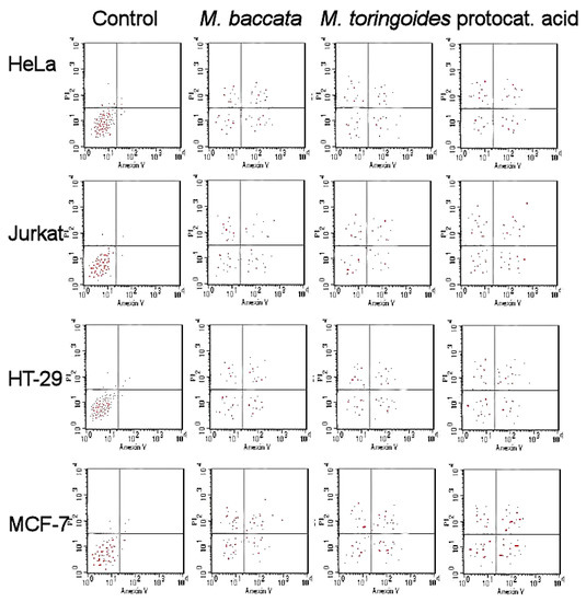The apoptotic assay of M. baccata and M. toringoides is shown in Figure 3. Necrotic cell accumulation was found in the early and late apoptotic phases.