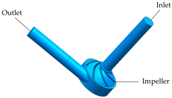 The centrifugal blood pump, as shown in Figure 1a, is used as the numerical calculation model. The design parameters are as follows: flow rate is 5 L/min, rotating speed is 3330 r/min, and the pressure difference between the inlet and outlet of the pump is 100 mmHg. The geometrical parameters of the centrifugal blood pump are shown in Table 1. Figure 1b is the geometric model of the centrifugal blood pump. The investigated medium is blood.