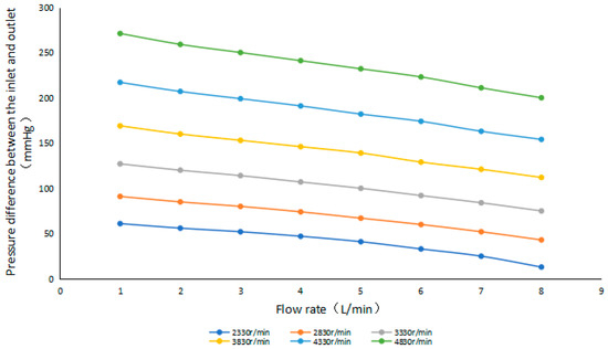In the study, the centrifugal blood pump has a differential pressure–flow characteristic curve, as shown in Figure 3. When the flow rate is 1, 2, 3 … 7, 8 L/min, the rotation speed is 2330, 2830, 3330, 3830, 4330, 4830 r/min, respectively.