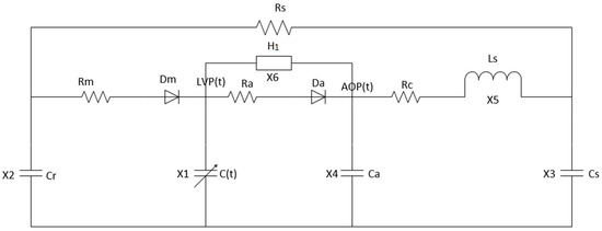 The left heart system is the equivalent to a circuit model. In this model, the voltage, current, resistance, capacitance, and inductance are used to represent the blood pressure, blood flow, resistance, compliance, and inertia in the blood circulation system, respectively [21]. In addition, the left atrium, right heart, and pulmonary circulation are simplified. Only one capacitive Cr is used to represent pre-load and pulmonary circulation. For the mitral and aortic valves, which control blood flow in one direction, a resistor and an ideal diode are connected in series to indicate the heart valve, where Rm and Dm represent the mitral valve and Ra and Da represent the aortic valve. The aortic compliance is represented by a capacitance Ca. The quaternary elastic cavity models Rc, Ls, Cs, and Rs are used to express the afterload [22,23]. The left ventricular elastic function model is used to control the left ventricular motion process to define the heart failure level. Grade IV heart failure ( = 0.63 mmHg/mL, = 0.05 mmHg/mL) has a heart rate of 75 beats/minute. One cardiac cycle is 0.8 s [24]. Figure 5 shows the circuit model of the left ventricular blood circulation system with a blood pump. The parameter values of the model are shown in Table 3, and the state variables are shown in Table 4 [25,26,27].