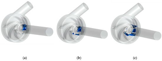 The cavitation inception (total inlet pressure 11 kPa), not severe cavitation (total inlet pressure 10 kPa), and severe cavitation (total inlet pressure 9 kPa) were selected for analysis. In order to observe the cavitation more clearly, a gas volume fraction of 0.1 was selected on the isosurface [29]. When the flow is 5 L/min, the inlet pressure is reduced, as shown in Figure 10. The cavitation bubble inside the impeller flow channels is uneven and the phenomenon of asymmetric cavitation occurs in the impeller flow channels. This phenomenon may be caused by the asymmetry of the pressure distribution in the flow channels of the blades due to the coupling of the impeller and the pump casing [30]. In addition, the cavitation in the impeller flow channel of the pump model appears at the position of the impeller flow channel near the hub at different inlet pressures. As the inlet pressure continues to decrease, the degree of cavitation gradually increases and the bubbles gradually diffuse toward the impeller outlet [31].