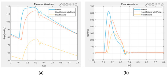 Figure 13 shows the numerical results of the grade IV heart failure model assisted by the variable speeds of the centrifugal blood pump. The figure shows the pressure and flow waveforms of the aorta in normal physiology, grade IV heart failure and grade IV heart failure with pump. It can be seen from Figure 13 that both aortic pressure and flow are greatly improved under the assistance of the centrifugal blood pump, and the trend is close to the normal physiological state under the assistance of variable speed. During the entire cardiac cycle, the variable speed assist changes its aortic flow and aortic pressure values, which may vary between 0 and 500 mL/s, and 75 and 115 mmHg, respectively.