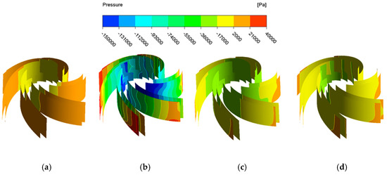 Pressure distribution of blades with variable speed: (a) t = 0.05 s; (b) t = 0.16 s; (c). t = 0.35 s; (d) t = 0.5 s.