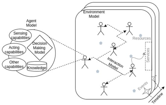 Multi-agent models include representation for the individual agents, their interaction, and the environment []. The relevant agent definition depends on what they are representing, e.g., humans, machines, particles, organisms, or computing systems. The key components of multi-agent models found in literature are illustrated in Figure 1 and described below.