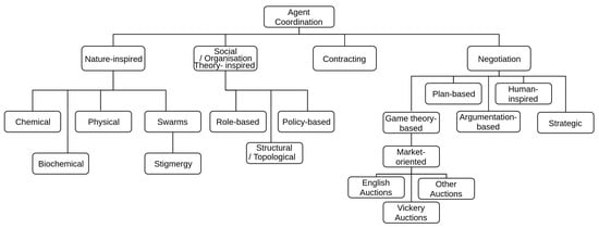 Different techniques for achieving coordination have been proposed. Authors of References [,] present a review of different approaches for coordination that include organisational structures (defined a priori by agent’s responsibilities, capabilities, connectivity, and control flow), contracting (to accomplish a set of tasks), planning (centralised or distributed plans that drive their behaviour/operation), and negotiation (seek agreement with others). In MAS literature, there is no clear distinction between negotiation and consensus. Other nature-inspired models for coordination include stigmergy (indirect coordination through, for instance, the environment), chemical coordination, physical coordination, and biochemical coordination []. Animal organisation has inspired models for addressing motion of agents. For example, swarms have enabled distinction of different group of agents as introduced by [] and presented in Table 4. Figure 2 identifies some of the most common coordination models found in literature.
