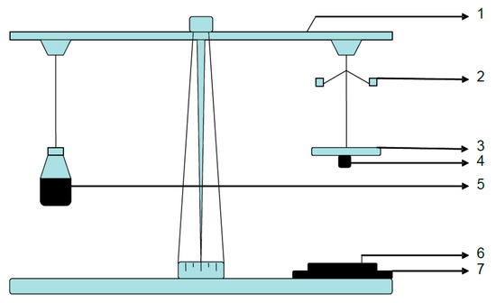 Experimental setup of Detachment Force Measurement. [1. Modified physical balance, 2. Counter weights, 3. Upper Glass Slide, 4. Tablet, 5. Conical flask to hold water, 6. Goat intestine, 7. Lower glass slide].