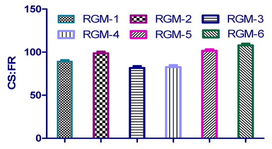 Six formulations (RGM-1 to RGM-6) were prepared by wet granulation technique with two different concentrations (25% and 40%) of extracted OG, TOG and SA. Prepared granules for all the formulations showed good flow property as evident from angle of repose (ranged from 26° to 29°), Hausner’s ratio (1.11 to 1.18) and compressibility index values (9%–12%). The compression force was adjusted to manage crushing strength in the range of 8–9 kg/cm2 and passed the DF test. Maximum and minimum percentage friability for all the formulations were reported between 0.084% and 0.1%, with no quantifiable variation among them. CSFR (ratio of crushing strength to friability) was found to be >80, which demotes for the substantial mechanical strength of the tablets (Figure 5). Weight and thickness variations were maintained at less than 2.5%.