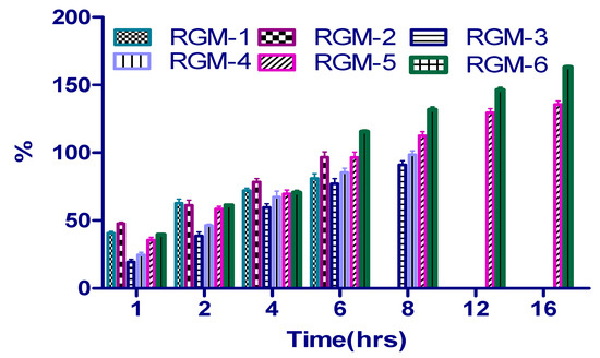 The swelling behavior of mucoadhesion polymers has an enormous influence on the adhesive and cohesiveness properties, hence water uptake of prepared formulations was evaluated. Figure 6 demonstrates the percentage of swelling of prepared batches, at different time intervals. Formulations (RGM-1 and RGM-2) with unmodified OG, swollen quickly, yet not able to retain the integrity because of rapid hydration followed by disintegration/erosion of the tablet. At the end of 6 h swelling behavior was found to be 89.27% ± 1.54% and 98.67% ± 1.99%. The swelling index for RGM-3 and RGM-4 was found to be 81.72% ± 2.07% and 82.63% ± 2.26% at the end of 8 h. At the same time, the highest swelling percentage of 112.50% ± 3.00% (RGM-5) and 131.8% ± 2.06% (RGM-6) was observed in the tablets which were formulated with thiolated polymer (TOG), which concludes the enhancement in hydration ability. The presence of thiol groups can accountable for the formation of a polymeric matrix which high water retention and strong intrachain disulfide bond formation. Furthermore, thiolated formulations remained stable for a longer period of time without erosion in comparison to remaining formulations.