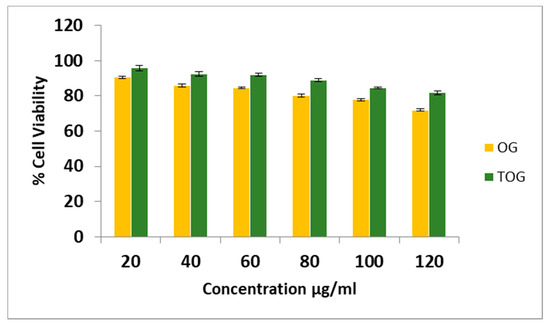 Cytotoxic study of OG and TOG at different concentrations on the HepG2 cell line. Each point represents the mean ± SD.