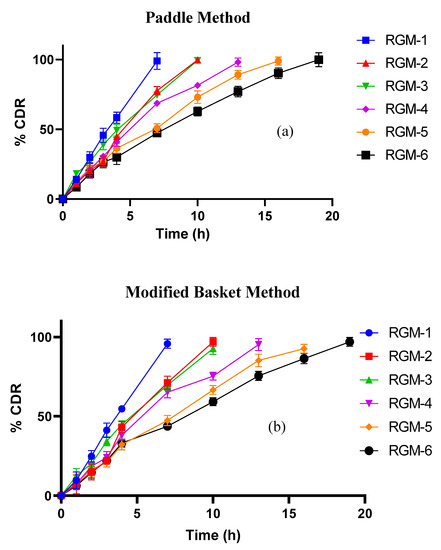 In vitro drug release profile for prepared bathes by (a) paddle method and (b) modified basket method.