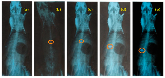 X-ray radiograms (a) Before administering RGM-6, (b), (c), (d) and (e) showing mucoadhesion of RGM-6 at 1 h, 2 h, 4 h, and 8 h respectively.