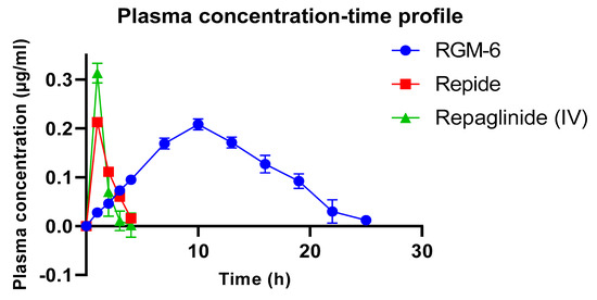 Plasma concentration-time profile for RGM-6 and REPIDE following oral administration (n = 6).