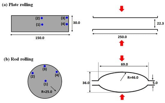 Most steel products are manufactured by the hot rolling process because the hot rolling process is one of the most efficient plastic forming processes in metal forming industries. In this process, the initial large and thick material, which is called slab, bloom, and billet, is changed to the desired shape by passing through two counter-rotating rolls in the temperature range of 900–1200 °C. Many researchers have been devoted to measuring and predicting the temperature of steels during the hot rolling process to improve the quality of hot-rolled products because the thermal history of steel has a strong influence on the quality of final products [,,,,,]. Typically, the hot rolling process is categorized into two groups: flat rolling and shape rolling. Plate and strip are made via the flat rolling process, whereas wire, rod, and bar are manufactured via the shape rolling process. The deformation behavior and thermal history of a rod during the shape rolling process are more complex than those of a plate during the flat rolling process because the rod experiences three-dimensional (3D) deformation during the shape rolling process, as shown in Figure 1. In contrast, the plate is deformed under the plain strain condition, i.e., two-dimensional (2D) deformation. This different deformation behavior between the two processes may induce different thermal history between plate and rod, leading to the different microstructures and mechanical properties between the two processes.