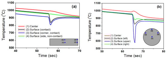 Figure 5b shows the temperature profiles of the rod with area during shape rolling, i.e., round-oval pass. The upper surface area, i.e., the hard contact surface, was cooled very fast. In other words, the lowest temperature of the rod was lower than 600 °C. This was a very surprising result considering the location of thermocouple in the surface—the surface indicated 1.5 mm from the outer surface. It is reasonable to induce that the temperature of the outer hard contact surface could be dropped below 500 °C. This low temperature at the rod surface was very different from the result of the plate during flat rolling, which is discussed in the next section. Ideally, the surface area at the right side had a similar temperature profile to the surface area at the left side, but they had somewhat different temperature profiles because the rod may not have rolled symmetrically in this study. That is, the temperature discrepancy between the right side surface and left side surface can be attributed to the error in alignment of a workpiece during the shape rolling process, which is frequently observed in an industrial rod rolling process. All the surface temperatures were recovered after rolling, owing to the redistribution of heat within the rod. Meanwhile, the center temperature of the rod increased when the rod passed through the roll bite, which was the result of the heat generation by plastic work. It is worth noting that the rod exhibited a higher temperature rise compared to the plate at the center area during the rolling process.