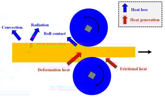 To have more useful information on the thermal behavior of the rod during shape rolling, a numerical simulation was conducted. During the hot rolling process, heat is transferred with several mechanisms as shown in Figure 6, which is summarized as follows: