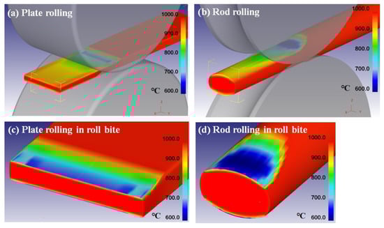 Comparison of contour maps of temperature during plate rolling and rod rolling.