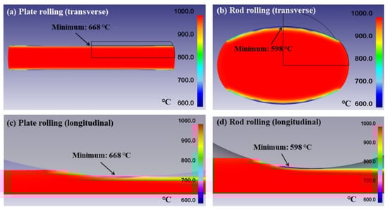 Figure 7 shows the temperature distribution of the rolled workpieces calculated by the FE numerical analysis. Temperature was varied with rolling process and area. The center area had the highest temperature and the surface area tended to have the lowest temperature during hot rolling, which is consistent with the measured temperature profiles using thermocouples (Figure 5). In both rolling processes, the hard contact surface area with roll had the lowest temperature due to the high conduction heat transfer by roll contact, whereas the center area had the highest temperature originating from the relatively small heat loss during hot rolling process. The surface temperature was different between the plate and rod. The upper surface and lower surface of the plate had similar temperatures, whereas the rod had a temperature variation along the circumferential direction of the surface area. For more detailed information, the temperature distribution in the cross section of the rolled workpiece near the roll bite is presented in Figure 8. It is clear that the surface of the rod had a different temperature along the circumferential direction, which meant that the hard contact surface and soft contact surface with rolls experienced different thermal histories. The maximum temperature was similar between the two processes, but the minimum temperature was different in plate and rod—the minimum temperature of the plate was 668 °C, and that of the rod was 598 °C. Therefore, the temperature difference of the rod with area was higher than that of the plate, which is consistent with the result of measured temperature profiles using thermocouples. However, the deviation in temperature between the results of simulation and experiment was in existence. For instance, the surface temperature of the rod was estimated at 500 °C on the basis of the experiment, but the surface temperature of the rod was 598 °C from the numerical simulation, which was closely related to the selected heat transfer coefficient for the numerical simulation. That is, the heat transfer coefficient in this rolling condition was higher than the selected value of 24 kW·m−2K−1.