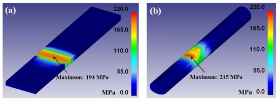 Contour maps of effective stress of (a) plate and (b) rod during the hot rolling process.