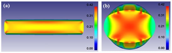 It is well known that the conduction heat transfer between the cold roll and hot workpiece is proportional to the contact pressure [,]. That is, the heat transfer coefficient by the roll contact increased along the arc of roll contact and reached the steady-state maximum values, and then decreased until the separation of the workpiece and roll []. Figure 9 shows the distribution of effective stress during plate and rod rolling processes. The plate had a uniform distribution of effective stress in the surface area. In contrast, the rod exhibited an inhomogeneous distribution of effective stress on the surface area—the upper surface area had the maximum value, and the effective stress gradually decreased along the circumferential direction from the upper surface. This different behavior of effective stress on the surface area between flat rolling and shape rolling made a different contact heat transfer coefficient between the two processes, leading to the different thermal history. In other words, the higher contact pressure in the upper surface of the rod during shape rolling led to the higher temperature drop in the upper surface area and the inhomogeneous temperature distribution along the circumferential direction of the rod. It is worth mentioning that the contact heat transfer coefficient also depended on rolling speed [], reduction ratio [], scale formation on the surface [], and lubrication condition [,]. However, the effect of roll shape was only considered in this study because the other process parameters were set as identical in the two processes.