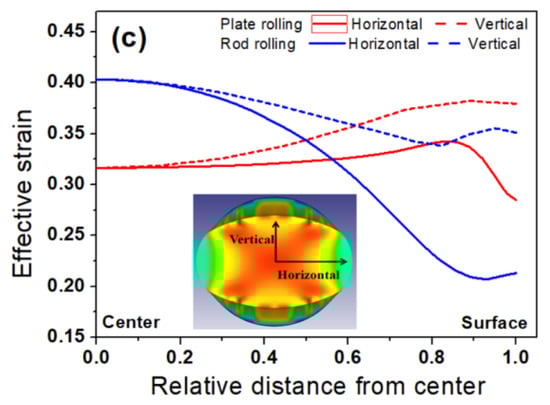 Contour maps of effective strain of (a) plate, (b) rod, and (c) comparison of profiles of effective strain along the horizontal and vertical directions of a workpiece.