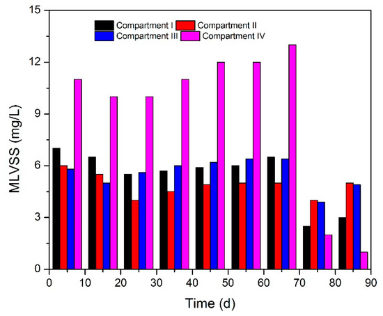 Figure 2 shows the variations of biomass concentration from each compartment of ABR, in which the initial MLVSS were 7.0, 6.0, 5.8, and 11.5 mg/L, respectively. The biomass in Compartments I to III presented a decrease first and then an increase along with the regulation of HRT (from Stage I to Stage II), indicating that the microbial activity and stable operation of ABR can be well maintained when suitable extension HRT is provided. However, the biomass concentration in Compartment IV notably decreased due to sludge floatation and loss when HRT was extended to 40 h, implying that relatively long HRT is beneficial for the growth of methanogens.
