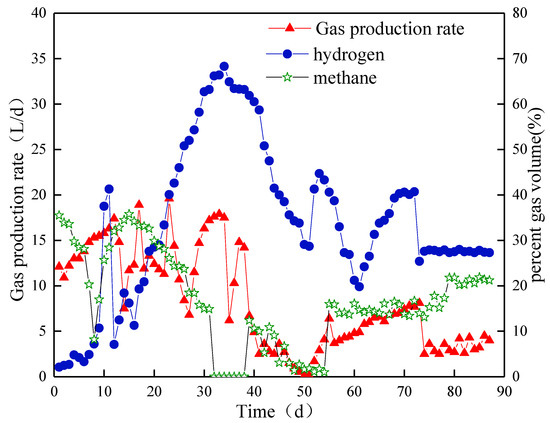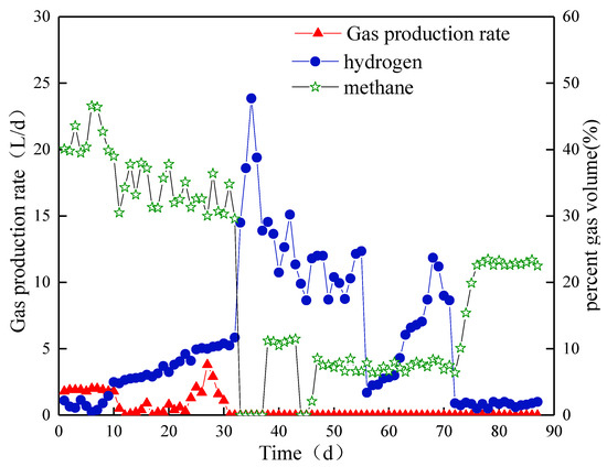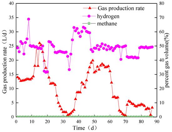 In the third stage, the biogas production did not change immediately after HRT was extended. However, the rate suddenly decreased to 4.0 L/d on day 73 and then slowly increased to 7.9 L/d after 84 days. At the end of this stage, no significant change in biogas production was observed. The biohydrogen content slightly decreased and stabilized at approximately 46% at the end of this stage. Methane production occurred from day 72, but the content was always below 2%.
