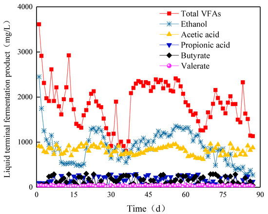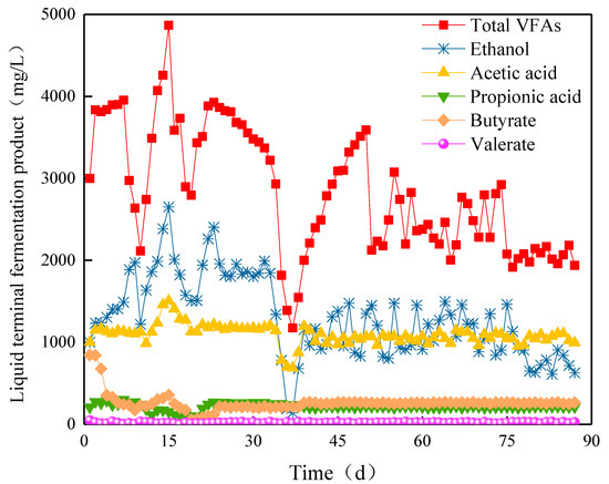 The VFA content was stable at Stage I. On day 10, the ethanol content rapidly increased to 1217.6 mg/L, while the content of other components was stable. The total amount of VFAs decreased rapidly to 2114.3 mg/L (Figure 9). In Stage II, the ethanol content continued to increase to 2651.4 mg/L at the highest level on the 15th day. At this time, the contents of acetic and butyric acids increased to 1505.4 and 356.5 mg/L, respectively, and the total amount of VFAs reached 4867.0 mg/L. From day 16, the content of VFAs decreased, and the total amount of VFAs decreased to 2794.6 mg/L with the decrease in the content of ethanol. With the operation of ABR, the content of ethanol increased to 2404.4 mg/L, and the total amount of VFAs increased to 3926.7 mg/L in day 23. At this time, the acetic acid content was 1217.2 mg/L, and the propionic and butyric acid contents were 268.5 and 118.0 mg/L, respectively, which presented a typical ethanol fermentation type. By introducing a new type of NMWW to ABR, the VFA content significantly decreased. On day 34, the ethanol content drastically decreased from 1340 to 140.4 mg/L. The total amount of VFAs decreased to 1173.9 mg/L with the decline in acetic acid. The content of ethanol recovered to 1154.3 mg/L from day 39 and slightly fluctuated with the operation of ABR. The acetic acid content gradually recovered to 1194.7 mg/L and then decreased slowly. The propionic and butyric acid contents remained at approximately 219.4 and 261.4 mg/L. The total amount of VFAs was approximately 2000 mg/L, which denoted ethanol fermentation type. In Stage III, the ethanol content began to decrease from day 76. However, the other components changed slightly, and the total amount of VFAs was approximately 1916 mg/L, which still showed ethanol fermentation type.