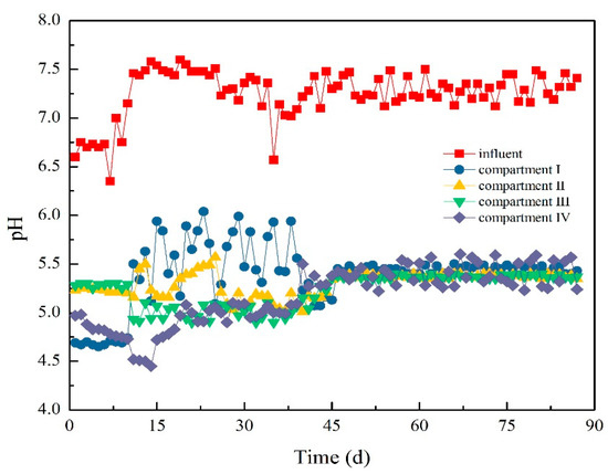 Methanogens have strict living conditions and slow metabolism and growth rate. The traditional theory considers methanogens as the first rate-limiting step in the anaerobic wastewater treatment process because biohydrogen production and acetic acid production stage is prior to methane production stage [18,19]. High organic matter can lead to low pH value through fermentation [20]. Thus, the inhibition of methanogens caused by relatively low pH is beneficial to increase the biohydrogen production rate. Therefore, this study proposes the startup and operation of ABR to investigate the biohydrogen production performance. In accordance with the regulation of hydraulic retention time (HRT), the characteristics of each compartment are discussed comprehensively. Furthermore, the enhanced biohydrogen production through HPA is discussed to provide a potential approach for eliminating methane production and preserving biohydrogen resources.