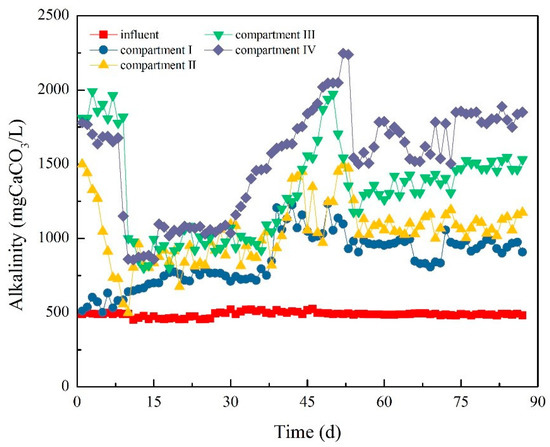 Figure 12 and Figure 13 demonstrate the variation in pH value and alkalinity in the ABR system. In the early phase of Stage I, the pH value of the influent was nearly 6.6, but the pH values of the compartments decreased to below 4.7, 5.3, 5.3, and 5.0. The alkalinity of each compartment greatly changed due to sludge loss in Compartments I and IV. The alkalinity of each compartment was oscillatory. Specifically, the alkalinity in Compartment I increased from 510 to 640 mg/L, and that in Compartment IV decreased from 1780 to 860 mg/L.