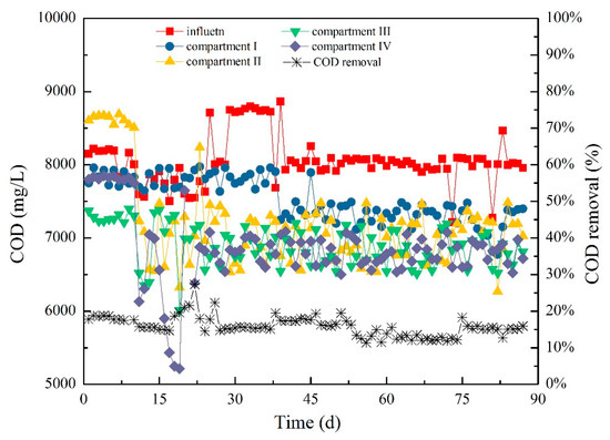 COD removal by anaerobic treatment system was mainly realized by methanogenic bacteria. The ABR system, which was characterized by the metabolism of acidogenic fermentation bacteria, could remove COD mainly through the release of CO₂ and H₂ because the pH value was not conducive to the relatively high bioactivity of methanogens. However, most COD was converted into volatile acids, including acetic, propionic, and butyric acids. Thus, the removal rate of COD was relatively low. Figure 14 shows the variation in COD from the effluent of each compartment during the operation of ABR. In the early phase of Stage I, the influent and effluent COD of each compartment were relatively stable, and the COD removal efficiency showed a slow upward trend (Figure 14). Subsequently, the COD concentration in each compartment also changed with the fluctuation of influent due to the fluctuation of COD. However, the COD removal efficiency of COD changed slightly and maintained at approximately 18%. In Stage II, the influent COD concentration still fluctuated, but the removal efficiency of COD increased to 27.3% and then stabilized at 18.0%. With the continuous fluctuation of COD concentration from influent, the content of VFAs in each compartment changed accordingly, and the removal efficiency of COD decreased to approximately 11.4% at the end of this stage. In Stage III, the COD concentration of each compartment was insignificantly improved with the further extension of HRT. Meanwhile, the COD removal efficiency gradually increased and finally stabilized at approximately 15.5%.