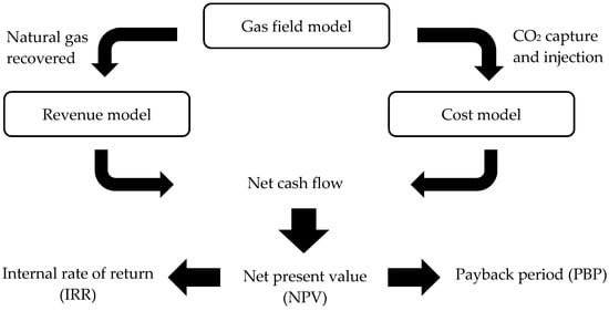 The CCS performance results for the natural gas field models are incorporated into two types of models, which are the revenue model and cost model. The revenue model comes from the value of the recovered natural gas, while the cost model is the cost of CCS, including CO2 capture, transportation, and injection for storage. The output of both models is net cash flow that is then discounted to obtain fiscal precursors comprising of Net Present Value (NPV), Internal Rate of Return (IRR), and Pay Back Period (PBP) of the project as shown in Figure 1.