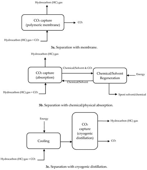 In the cryogenic distillation CO2 separation method, CO2 is purified by separating the gas mixtures using distillation at low temperature and fractional condensation, leveraging on their de-sublimation properties and different condensation level as shown in Figure 3c. The low-temperature distillation is a mature process used to liquefy and purify CO2 from relatively high purity (>90%) sources. The process starts with the cooling of the gas to a very low temperature of <−73.3 °C, to freeze out/liquefied and separate the CO2. During which, cryogenic air separation unit (ASU) was used to supply high purity oxygen to a boiler. This step condenses most of the moisture and removes any carried over particles. The produced high purity oxygen is then blended with the recycled flue gas before combusted in the boiler to maintain combustion conditions comparable to air fired configuration. This is crucial as the presently existing materials for construction could not survive the high temperatures resulting from combustion in pure oxygen [44]. Table 1 shows the advantages and disadvantages of the selected CO2 capture technologies.