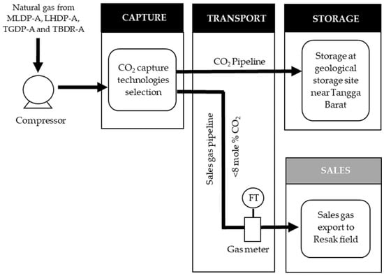 In this case study, an annual average sales gas of 220 MMscf/d with 15 years of production life is estimated [33]. CO2 storage identified for this study is situated at an underground geological storage site approximately 20 km away from the Tangga Barat fields (near the Laho and Tangga fields) whereby the injected CO2 is to be stored while ensuring there is no increase of the reservoir pressure above the fracture pressure of the storage formation [34,35]. The facilities required will be a dedicated CO2 compression platform and its associated pipelines and injection wells at the Tangga wellhead platform [34,35].