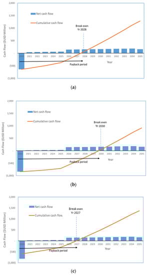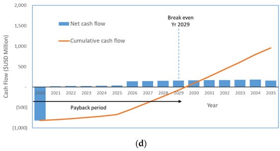 This study on techno-economic analysis provides the fiscal precursor and its outlook for Tangga Barat natural gas field for CCS implementation starting from the year 2020 with a projection of 15 years project lifetime. The calculation outputs of project cash flow and total annual cash outflows, as well as its inflows throughout its lifetime, is as shown in Figure 5a–d. It can be seen that as the project extends into the exploration stage, the annual project cash flow will begin to increase in a positive note. During operation, inflow arrives from the natural gas sales revenue and outflows derive from the O&M, royalty, and tax costs.
