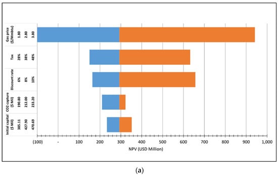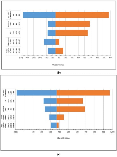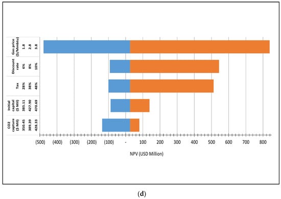 Figure 6a–d depicts variation scenarios and its impact change to the five input variables, gas price, discount rate, tax, CO2 capture technology cost, initial capital cost, and its effect on the risks affecting the fiscal precursor that is NPV and its sensitivity range. The sensitivity bound is defined as favorable/unfavorable by changing the baseline value, testing the different scenarios of that certain investment based on the specified five input variables. A ±10% range was implemented for the initial capital cost, tax, and CO2 capture technologies and this is as supported by the literature [54]. For the gas price, the range of ±USD 1.0 Million/MMBtu was selected as it reflects the gas price trend for the past 5 years [58]. The discount rate of ±2% was estimated based on previous studies conducted by established bodies such as the US Department of Energy, International Energy Agency Greenhouse Gas (IEAGHG), Electric Power Research Institute (EPRI), and UK Department of Energy and Climate Change (DECC) [62].