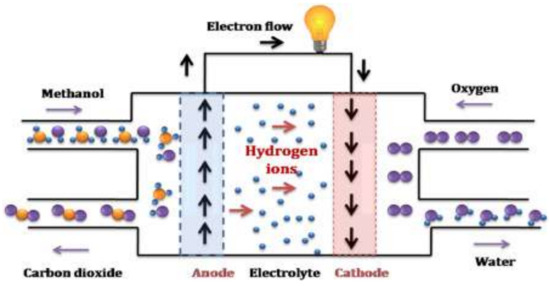 In the present juncture of the energy crisis, it has become inevitable to find alternatives for the mainly exploited fossil fuels. Recent developments in the field of fuel cells have given encouraging results suggesting their possible use of replacing the conventional highly polluting, less efficient combustible engines [1,2]. In this context, the direct methanol fuel cell (DMFC) appears to be the most promising tool to provide power to portable electronic devices. This is an electrochemical cell that has advantages such as offering a simple and easy method to store fuel, a simple design and green emissions. DMFC is a subcategory of a proton exchange membrane fuel cell (PEMFC) in which methanol is used as fuel. The salient features of DMFCs are the ease of transport of methanol, low or zero emissions, reliability in operation and utilization of methanol directly as a fuel to convert chemical energy into electric power. These DMFCs are designed especially for portable applications, where energy and power density are more important than efficiency [3,4]. A simple DMFC consists of a methanol distributor, gasket, anode, membrane, cathode, and oxygen gas distributor.