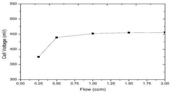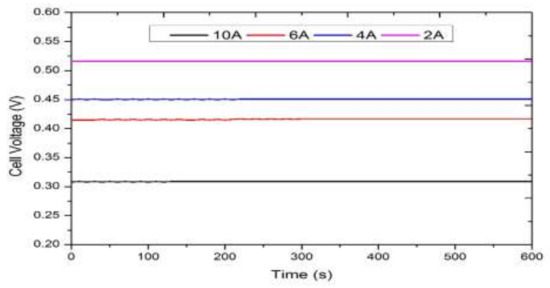 It was observed from Figure 9 and Figure 10 that an increase in the DMFC temperature from 303 K (30°C) to 333 K (60°C) led to an increase in DMFC performance, butfor a further increase in temperature beyond its boiling point 333 K (60°C), DMFC performance was reduced due to the dry-out effect. Hence, it is reported that 333 K (60°C) is the optimum operating temperature at which a maximum power density of 57.6 mW/cm2 was obtained for a squoval-shaped manifold design (SSMD)-incorporated direct methanol fuel cell. In addition to the studies on temperature, the durability of a DMFC at different load currents, namely 2A, 4A, 6A, and 10A, was also studied.Output voltages were recorded and are shown in Figure 11. It was confirmed by the consistent, steady output that the SSMD-based DMFC was durable at the optimized operating conditions, namely a DMFC temperature of 333 K, a methanol concentration of 1 M, and a methanol flow rate of 1 mL/min.